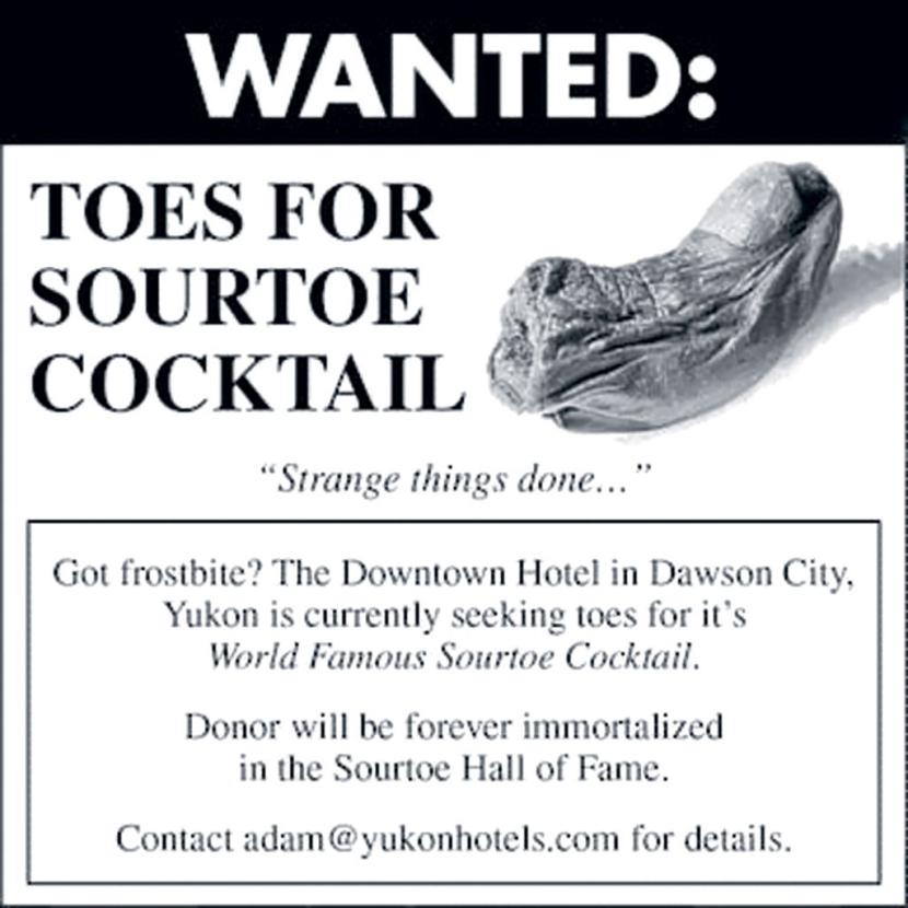 Szklanka whiskey z pływającym w niej prawdziwym, zakonserwowanym palcem u nogi, czyli paluchem, to osobliwy koktajl, jaki nieustraszeni klienci zamawiają w jednym z barów kanadyjskiego miasta Dawson City. Obowiązuje zasada, że palucha nie można połykać, ale trzeba dotknąć go wargami. Jeśli przypadkiem paluch zostanie połknięty, klient płaci karę w wysokości 500 dolarów kanadyjskich (480 amerykańskich). Do tej pory koktajlu zasmakowało podobno 60 tys.