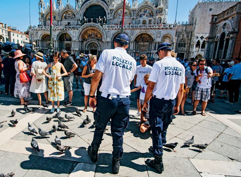 Dwoje odpoczywających turystów wygląda na zdumionych, gdy zostają zgonieni ze stopni portyku otaczającego plac św. Marka w Wenecji. Stali się pierwszymi ofiarami tzw. aniołów dobrych manier, którzy monitorują najbardziej zatłoczone obszary miasta w poszukiwaniu oznak nieodpowiedniego zachowania. Wygląda to na syzyfową pracę. W mieście, które codziennie odwiedza około 60 tys. osób, upomnianych gości za chwilę zastąpią nowi. Są jednak tacy, którzy oprócz tego, że siadają gdzie popadnie, popełniają o wiele poważniejsze wykroczenie.