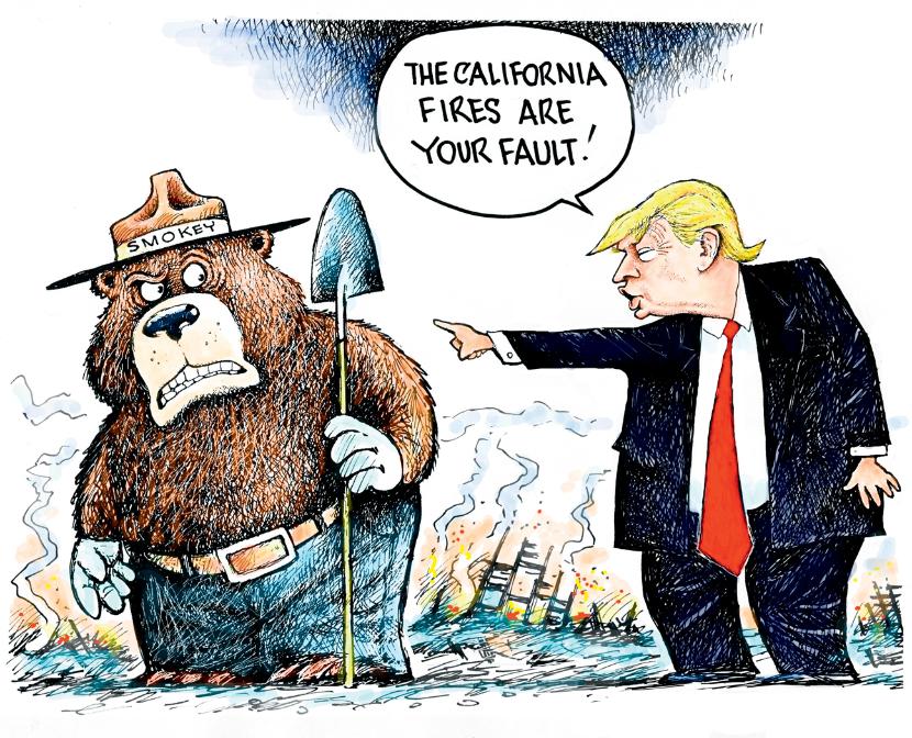 Donald Trump odwiedził Kalifornię po katastrofalnych pożarach. – Prezydent Finlandii powiedział, że u nich robią różne rzeczy inaczej. Na przykład grabią lasy – oświadczył. Sauli Niinistö nie przypomina sobie takiej rozmowy. – Ciekawe. Grabię liście, ale tylko na swoim własnym podwórku – twierdzi zaś prezes fińskiego stowarzyszenia leśników. Pomysły prezydenta USA wywołały lawinę żartów na Twitterze. – A niech nas pocałuje w d... Głosowaliśmy na Trumpa, ale gada jakieś głupoty – mówią pogorzelcy reporterom „Guardiana”.