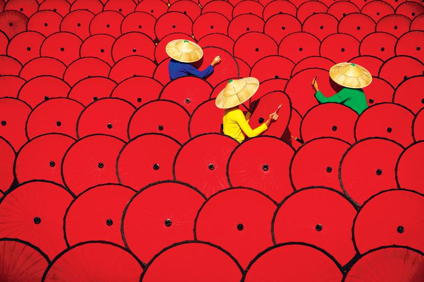 Pomalowanie takiej bambusowej parasolki wcale nie jest prostym zadaniem, dlatego rzemieślnicy z miasta Began w Birmie bardzo poważnie i starannie podchodzą do swojej pracy. A parasolka – używana zarówno przez kobiety, jak i przez mężczyzn – doskonale chroni przed palącym słońcem, które w tej części świata potrafi naprawdę dokuczyć.