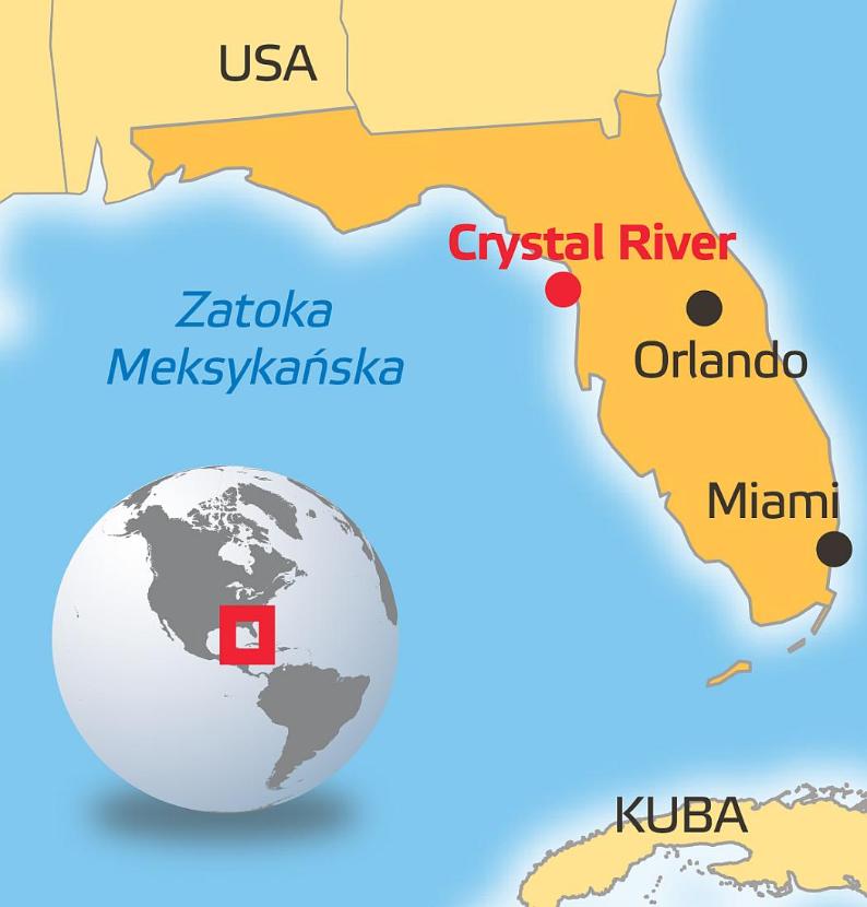 Opary mgły unoszą się nad Crystal River. Płaskodenna łódź kapitana Eda Menstera, która wygląda trochę jak olbrzymi wózek golfowy bez kół, wpływa prosto w biały obłok. Na szerokiej rzece, niedaleko zachodnich wybrzeży Florydy, jeszcze jest chłodno. Kilka znudzonych pelikanów obserwuje z brzegu, jak na łodzi pasażerowie w neoprenowych piankach w pośpiechu łykają z plastikowych kubków gorącą czekoladę, po czym zakładają okulary oraz rurki do nurkowania i wskakują do ciemnej wody. „Wow!”, „Cool!