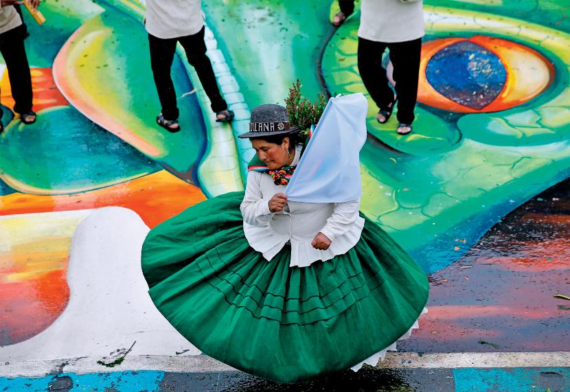 Mieszkanka boliwijskiego departamentu Oruro tańczy podczas karnawałowej zabawy w podzięce dla Matki Ziemi, czyli inkaskiej bogini Pachamamy, za plony, dobre zdrowie i pomyślność. Oruro było ważnym ośrodkiem kultury jeszcze w czasach prekolumbijskich. Kiedy władze kolonialne wprowadziły zakaz oddawania czci miejscowym bogom, mieszkańcy połączyli elementy starych wierzeń z chrześcijańskimi tradycjami karnawałowymi.