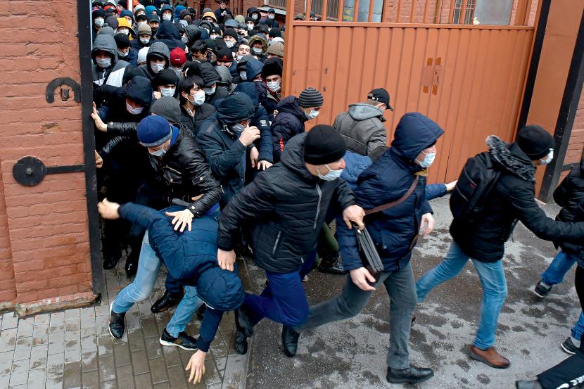 Imigranci z Azji Środkowej szturmują – otwarty tylko na kilka godzin w związku z epidemią – urząd pracy w Petersburgu, by przedłużyć swoje pozwolenia na pracę w Rosji.
