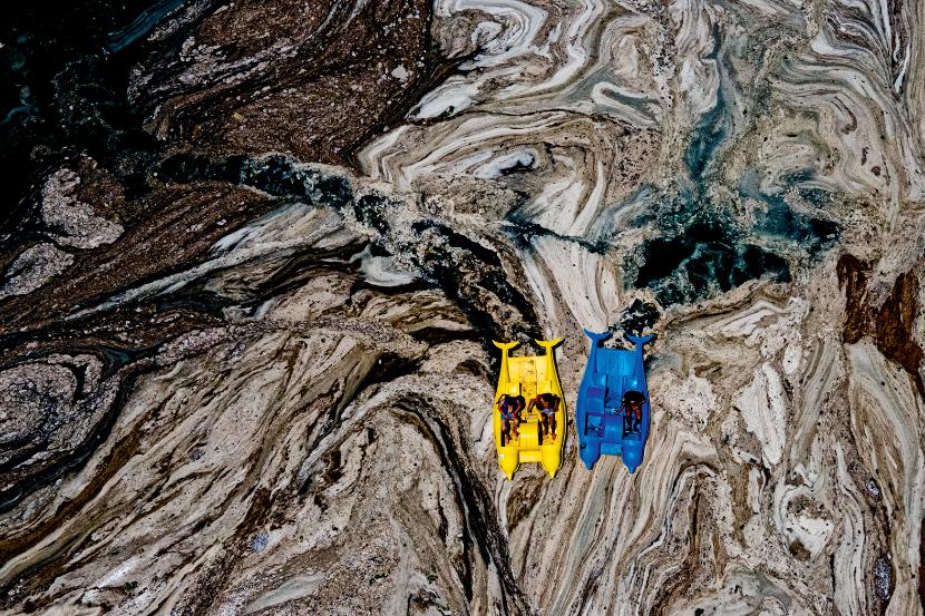 Ta fotografia lotnicza przedstawia dwa rowery wodne na morzu Marmara, między Bosforem a Dardanelami. Urlopowicze brną przez fale śluzu wytwarzanego przez fitoplankton, zwanego po angielsku obrazowo „morskimi smarkami”. Substancja jest groźna dla małych ryb i morskich stworzeń, ponieważ utrudnia im oddychanie. Fitoplankton rozwija się w cieplejszych wodach, więc zdaniem ekspertów zmiana klimatyczna spowoduje częstsze pojawianie się śluzu.