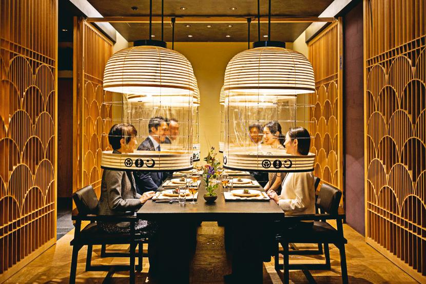 W luksusowych japońskich restauracjach hoteli Hoshinoya goście cieszą się kolacją, korzystając z przeciwcovidowej ochrony. Siedzą pod wielkimi przezroczystymi lampionami, wykonanymi na zamówienie przez firmę Kojima Shouten. Każda „kopuła” ma 102 cm wysokości i 72 cm średnicy. Ponieważ jest składana, łatwo pod nią wejść. Plastikowy front (0,15 mm grubości) zapobiega rozprzestrzenianiu się kropelek śliny podczas mówienia, a otwarty tył umożliwia dostęp powietrza. Całe pomieszczenie jest wietrzone co najmniej pięć razy na godzinę.