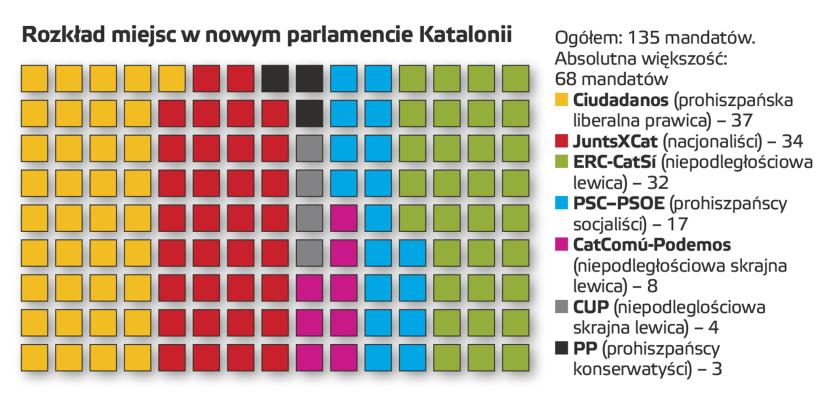 Misterny plan premiera Hiszpanii Mariana Rajoya legł w gruzach. Po październikowym referendum w Katalonii i jednostronnej deklaracji niepodległości, na którą Madryt odpowiedział zawieszeniem autonomii i rozpisaniem przyspieszonych wyborów, Katalończycy mieli odwrócić się od skompromitowanych liderów i oddać głosy na przeciwników secesji. W pewnym sensie ten scenariusz się spełnił. Wygrała centroprawicowa partia Ciudadanos (Obywatele), zapewniając sobie 37 mandatów w 135-osobowym parlamencie. To jednak pyrrusowe zwycięstwo, bo ugrupowanie, na czele którego stoi wschodząca gwiazda hiszpańskiej polityki Inés Arrimadas, praktycznie nie ma szans utworzyć rządu.